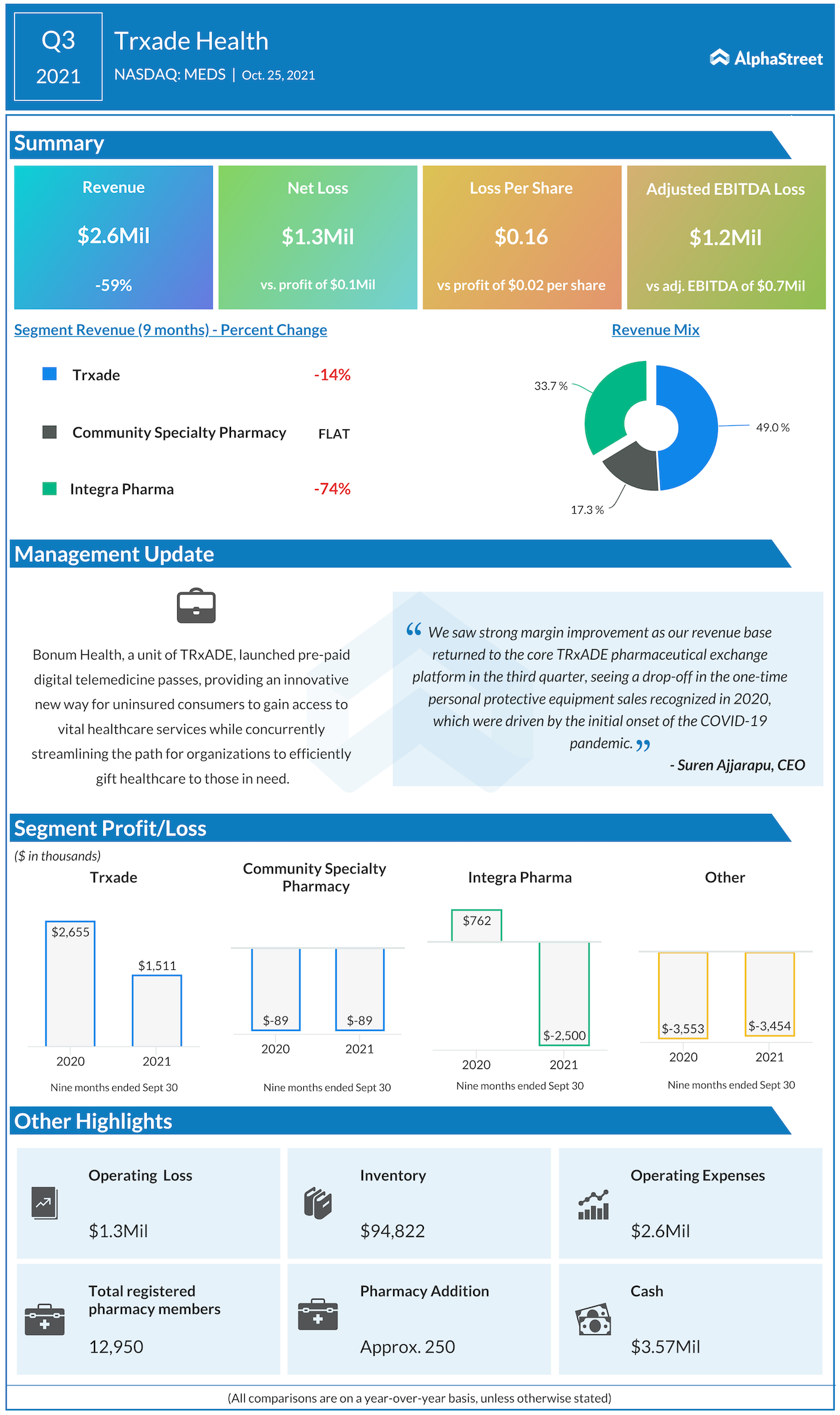 Trxade Health Inc (NASDAQ: MEDS) on Monday posted third-quarter revenues of $2.6 million, down year-over-over as a result of non-recurring PPE sales. However, this was higher than what analysts had anticipated.