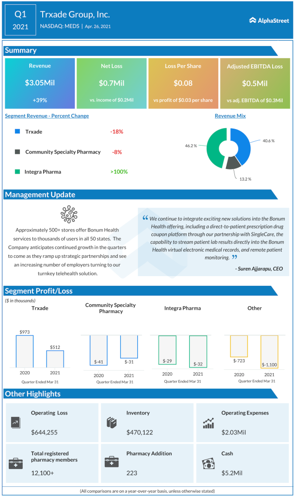 Trxade last week posted a 39% increase in first-quarter revenues to $3.1 million, higher than what analysts were expecting. Meanwhile, the company swung to a net loss of $0.08 per share from a profit last year due to higher costs associated with PPE. Analysts had anticipated a loss of $0.05 per share.