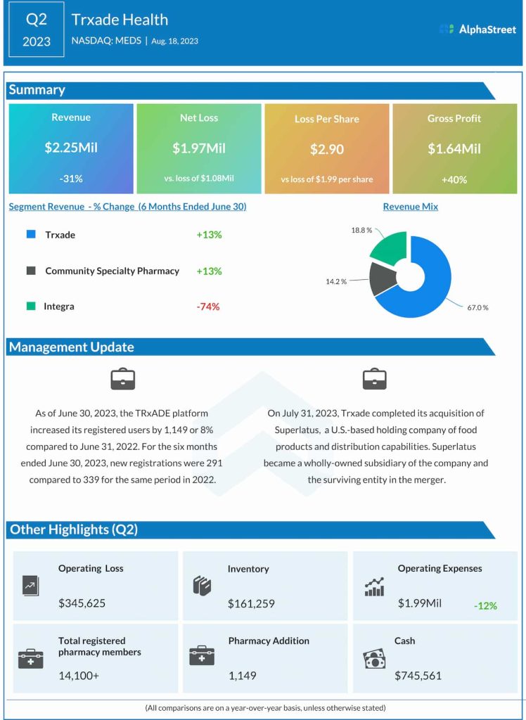 In the second quarter, the results for which were published a few months ago, Trxade’s revenues declined 31% from last year to $2.25 million, mainly reflecting weak performance by the Integra subsidiary. Net loss attributable to the company was $1.97 million or $2.90 per share in Q2, compared to a loss of $1.08 million or $1.99 per share in the same period of last year. The Trxade platform increased its registered users by 1,149 or 8% as of June 30, 2023, compared to the corresponding period of 2022.