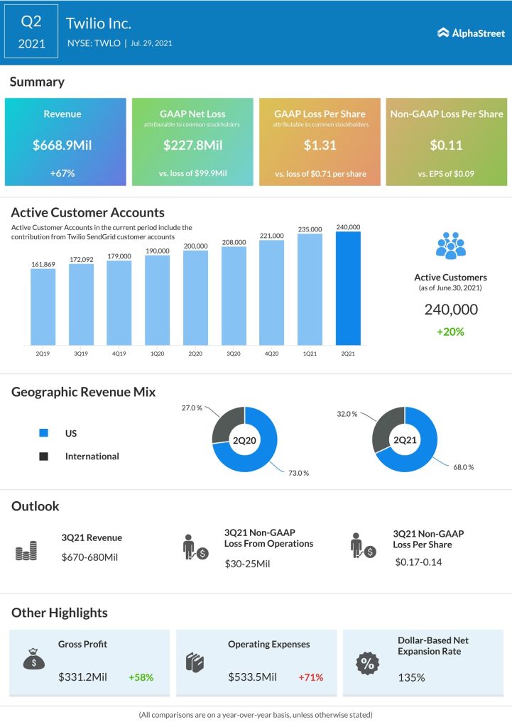 “Our strong momentum continued in the second quarter as our revenue growth accelerated at a run rate of more than $2.6 billion. Companies across industries are adopting our platform to drive better, more personalized levels of customer engagement, and we remain convinced that we are in the midst of a massive shift that is driving a generational opportunity for Twilio.”