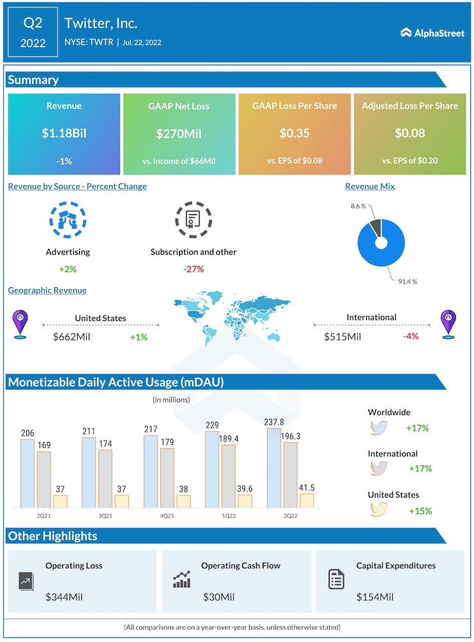 Twitter, Inc. (NYSE: TWTR) reported second quarter 2022 earnings results today.