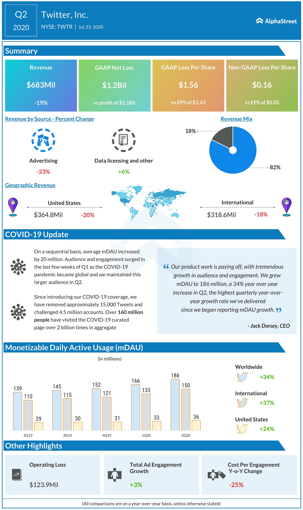 Twitter, Inc. (NYSE: TWTR) today announced its second quarter financial results for the period ended June 30, 2020.