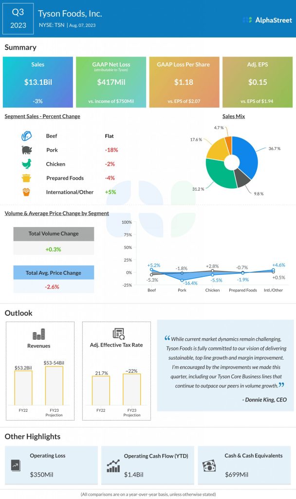 Tyson recorded the biggest revenue drop of 18% in its pork segment in Q3, which was driven by lower pricing due to softer demand. Price was down 16% while volumes fell 1.8%. As stated on the quarterly conference call, this segment continues to be impacted by market pressures in live operations, lower exports and the impact of a fire at one of its manufacturing facilities.