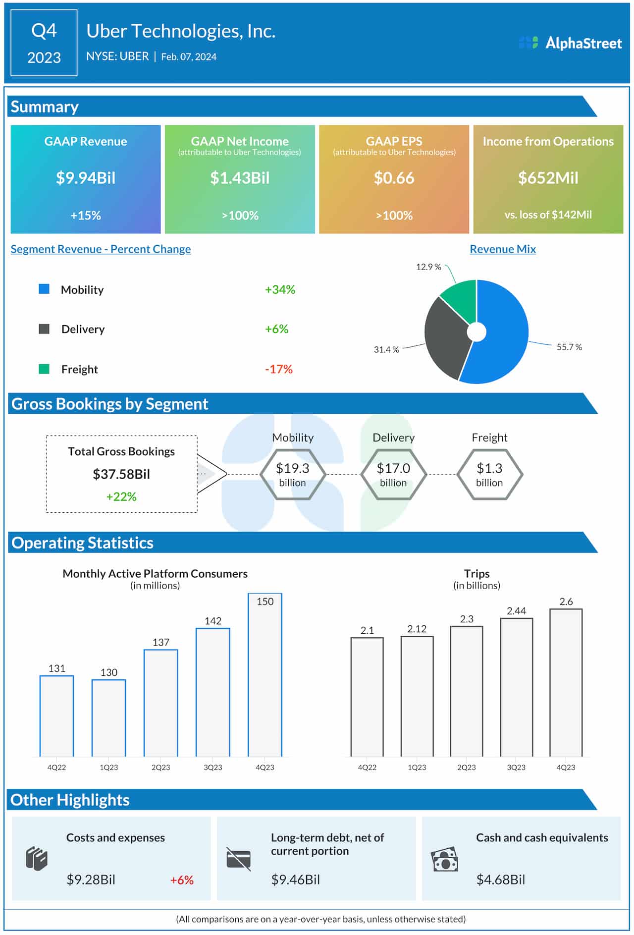 “2023 was an inflection point for Uber, proving that we can continue to generate strong, profitable growth at scale. Our audiences are larger and more engaged than ever, with our platform powering an average of nearly 26 million daily trips last year,” said Dara Khosrowshahi, chief executive officer of Uber.