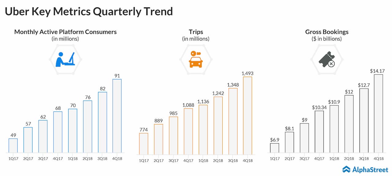 For the quarter ended December 31, 2018, the company had 3.9 million ridesharing drivers and 1.5 billion trips on its platform. Trips represent the number of completed consumer ridesharing or New Mobility rides and Uber Eats meal deliveries in a given period. In 2018, Uber’s Gross Bookings grew 45% year-over-year to $49.8 billion.