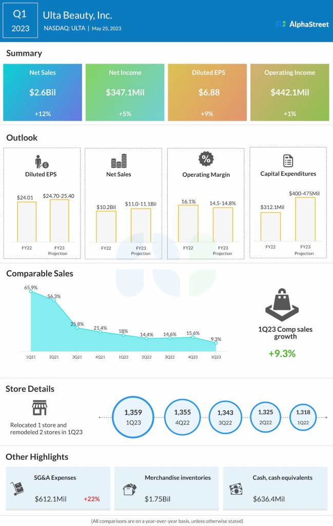 Ulta Beauty, Inc. (NASDAQ: ULTA) reported net sales of $2.6 billion for the first quarter of 2023, up 12.3% from the same period a year ago. Comparable sales grew 9.3%.
