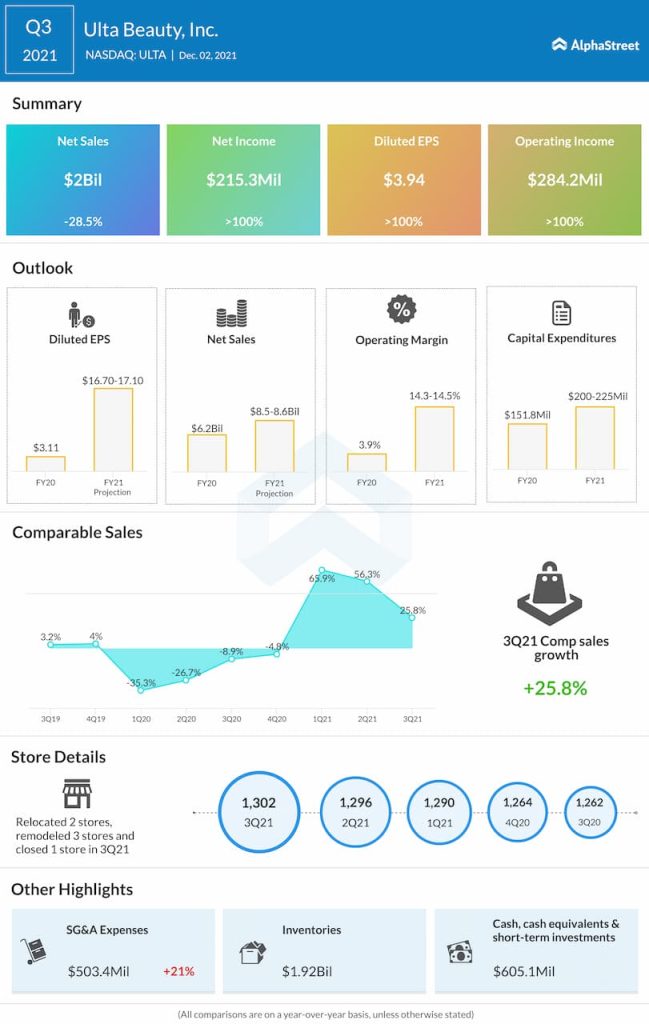 Ulta Beauty, Inc. (NASDAQ: ULTA) reported net sales of $2 billion for the third quarter of 2021. This was up 28.6% from the year-ago quarter thanks to the easing of pandemic-related restrictions. Comparable sales increased 25.8%.