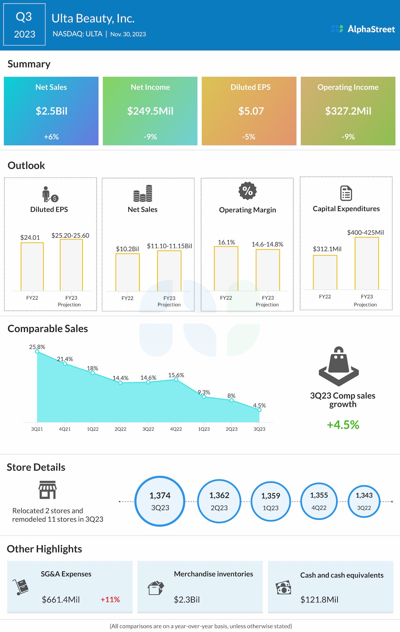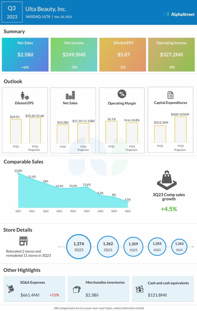 Ulta Beauty, Inc. (NASDAQ: ULTA) reported net sales of $2.5 billion for the third quarter of 2023, up 6.4% year-over-year, helped by increased comparable sales, strong new store performance, and strong growth in other revenue. Comparable sales increased 4.5%.