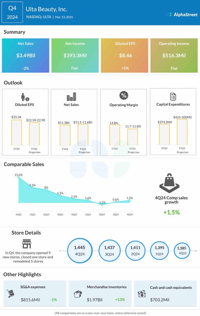 In Q4 2024, Ulta Beauty’s net sales decreased nearly 2% year-over-year to $3.5 billion. Comparable sales increased 1.5%. Gross margin rose to 38.2% from 37.7% last year and earnings per share grew 5% to $8.46.