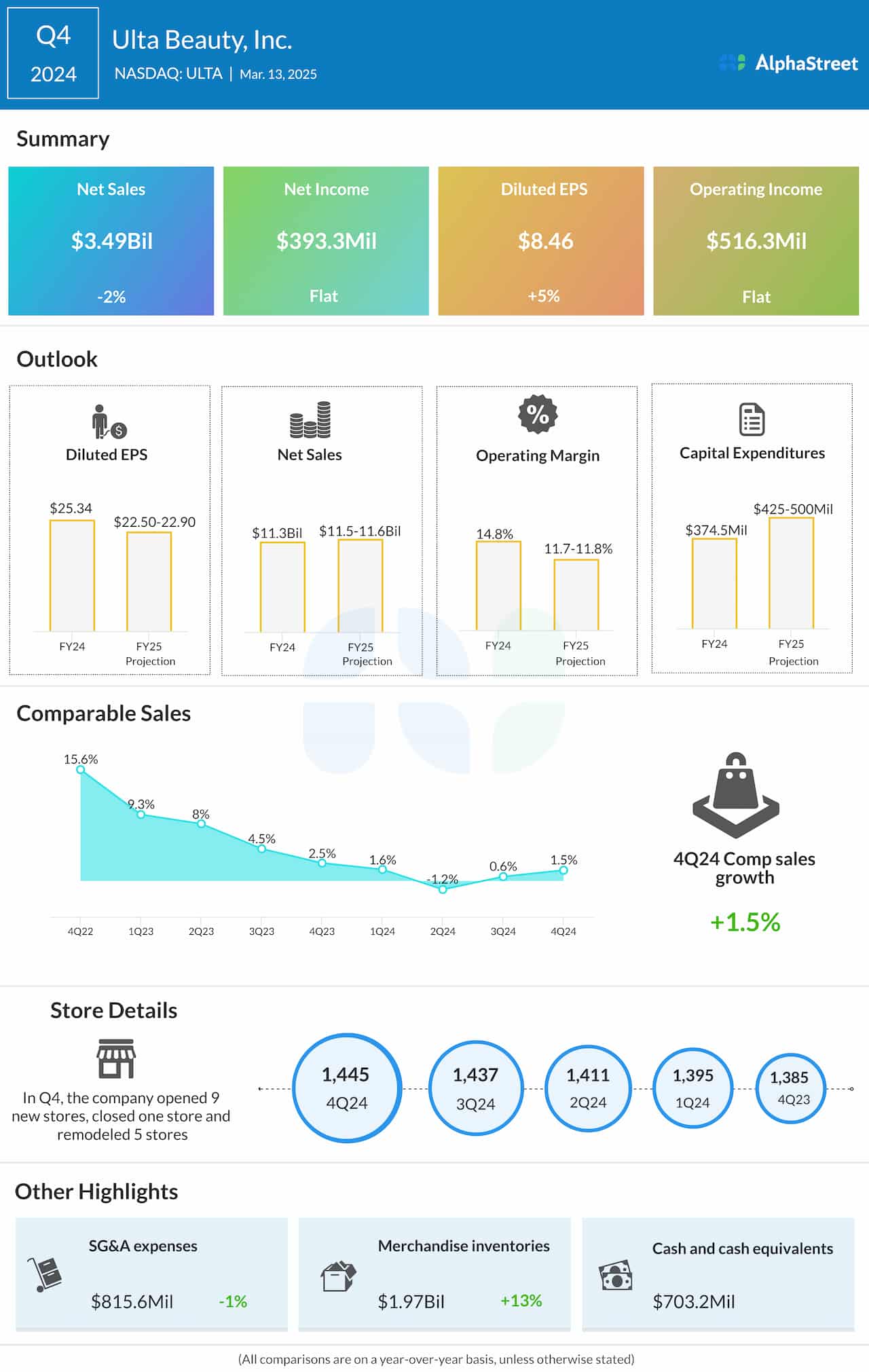 For fiscal year 2025, ULTA expects net sales of $11.5-11.6 billion and comparable sales growth of 0-1%. EPS is expected to be $22.50-22.90.