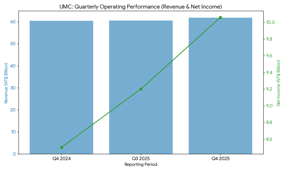 For the three-month period ending December 31, 2025, UMC reported consolidated revenue of NT$61.81 billion ($1.97 billion). This reflects a **2.4% increase** compared to NT$60.39 billion in the fourth quarter of 2024. Net income attributable to shareholders was NT$10.06 billion, an increase from NT$8.50 billion in the prior-year period.