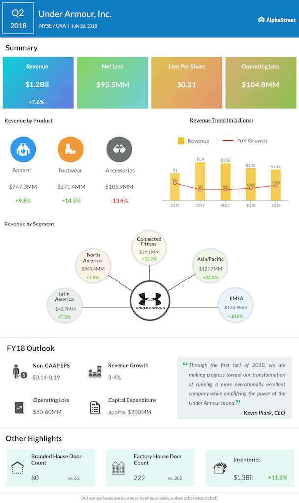 Under Armour also updated its 2018 outlook. For the full year, the company now expects revenue to increase 3-4% reflecting low to a mid-single-digit decline in North America and international growth of over 25%. In the prior outlook, the company expected net revenue to climb a low single-digit percent.