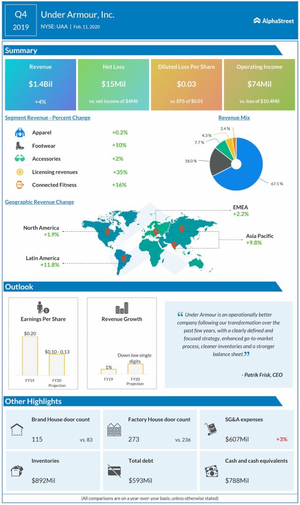 Under Armour, Inc. (NYSE: UAA) reported first-quarter 2020 earnings results before the regular trading hours on Monday. The results were weaker than what analysts had anticipated.