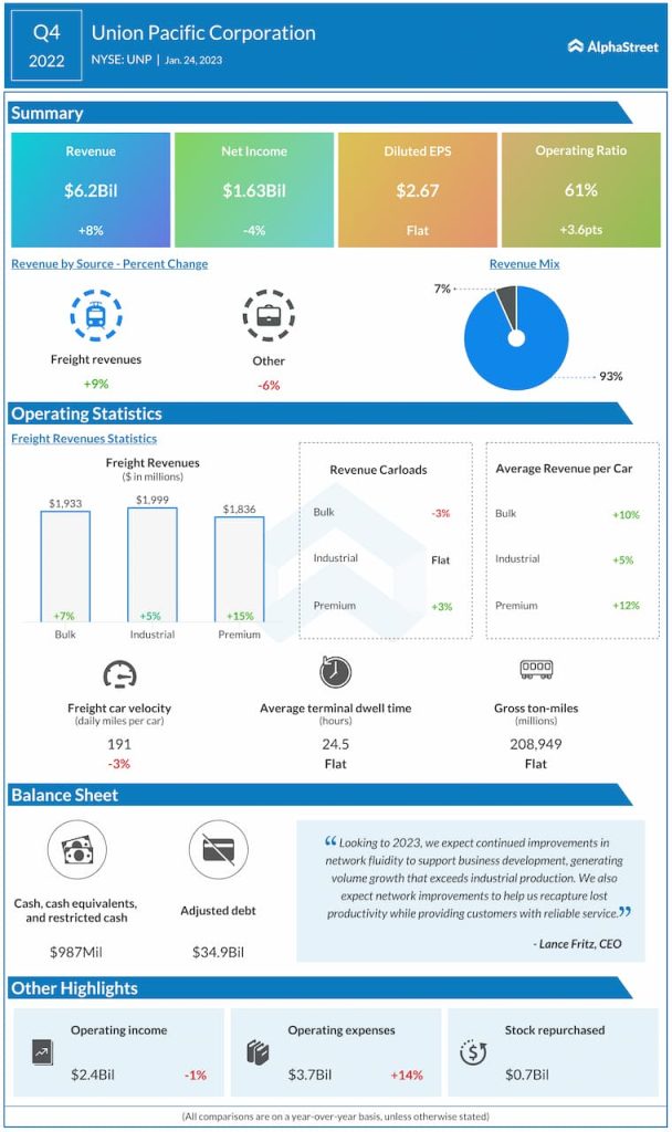 Union Pacific Corporation (NYSE: UNP) reported operating revenue of $6.2 billion for the fourth quarter of 2022, up 8% year-over-year. Net income was $1.6 billion, or $2.67 per share compared to $1.7 billion, or $2.66 per share last year. Business volumes, as measured by total revenue carloads, were up 1%.