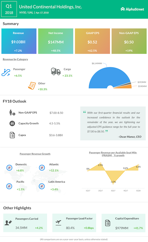 United Airlines (UAL) reported its first-quarter results on Tuesday after the closing. The company reported adjusted earnings of $0.50 per share, beating street estimates. Revenue rose 7% to $9.03 billion compared to $8.43 billion in the prior-year quarter. Top-line performance was driven mainly by a 23% increase in cargo revenues.
