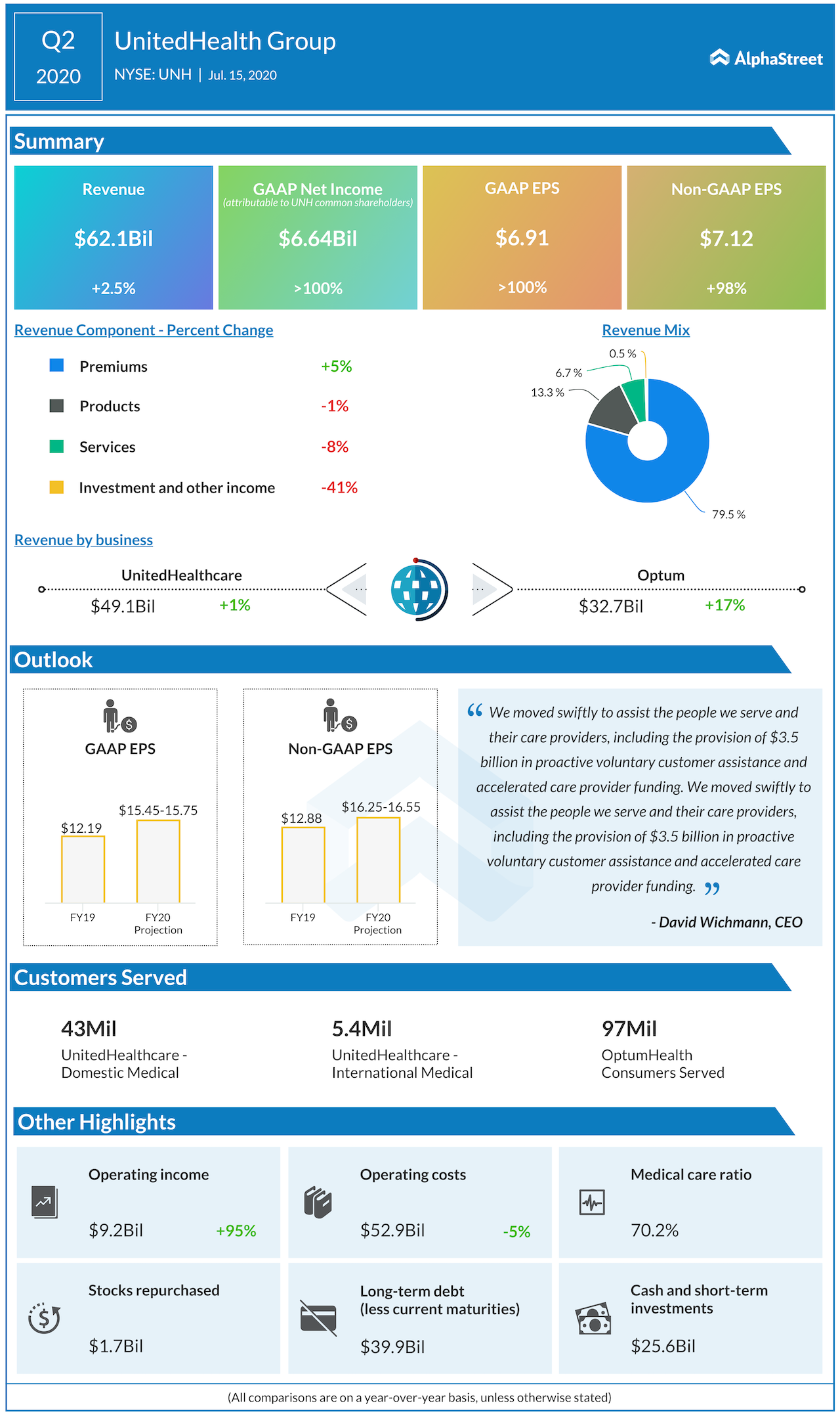 In the second quarter, a 5% growth in premiums, the main revenue driver, more than offset weakness in the other operating segments, resulting in a 2% increase in total revenues to $62 billion. Optum, the health services arm, witnessed double-digit growth. More than the top-line growth, earnings benefited from a marked decrease in operating costs and almost doubled to $7.12 per share.