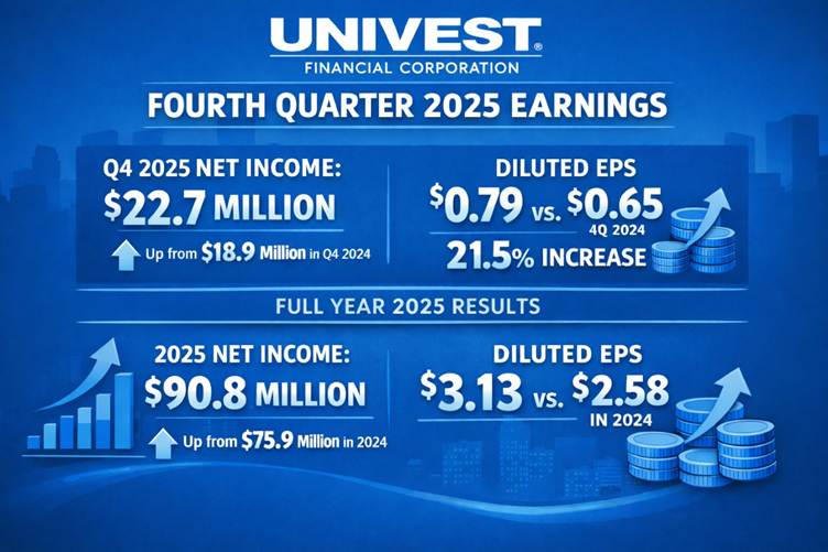 Univest Financial Corporation (NASDAQ: UVSP), including its wholly-owned subsidiary Univest Bank and Trust Co., Member FDIC, has approximately $8.4 billion in assets and $5.9 billion in assets under management and supervision through its Wealth Management lines of business at December 31, 2025. Headquartered in Souderton and founded in 1876, the company and its subsidiaries provide a full range of financial solutions for individuals, businesses, municipalities and nonprofit organizations primarily in the Mid-Atlantic region. Univest delivers these services through a network of more than 50 offices and online at www.univest.net.