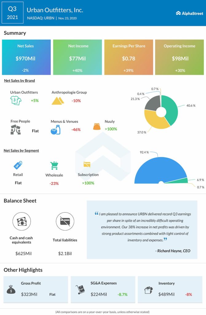 Urban saw store traffic decline across all its brands during the quarter due to restrictions in operating hours brought on by the pandemic. Even though traffic slowly picked up sequentially throughout the quarter, toward the end of October, the resurgence of the pandemic caused a slowdown again.