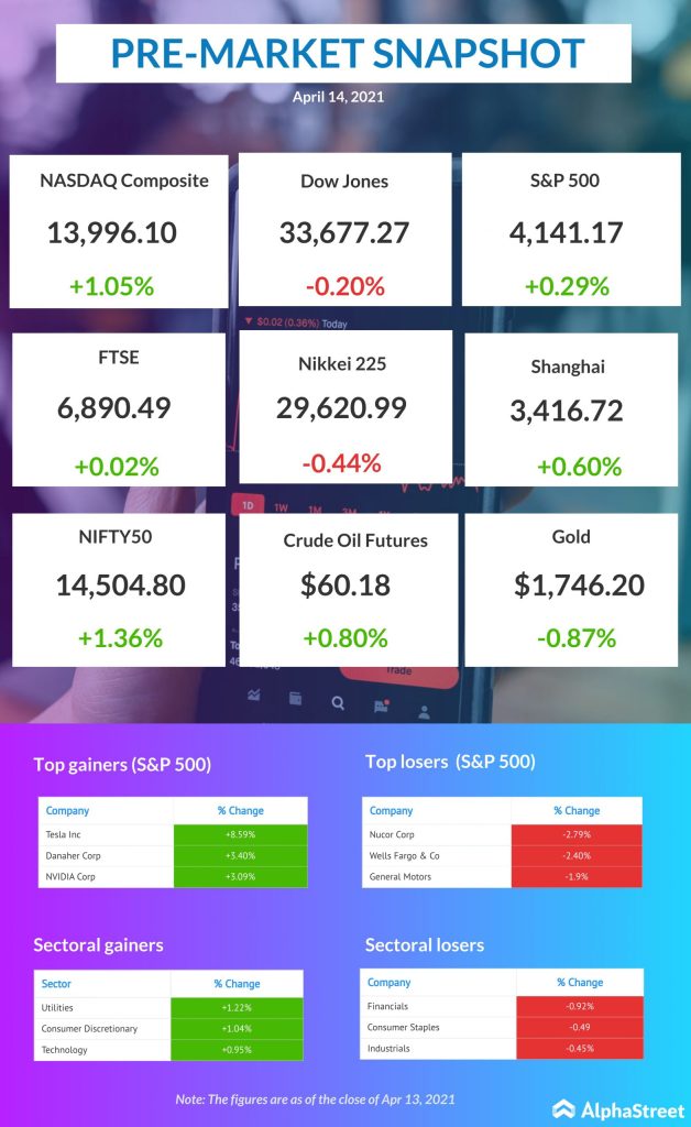 US pre-market news: Dow Jones, NASDAQ, S&P updates for Apr. 14, 2021