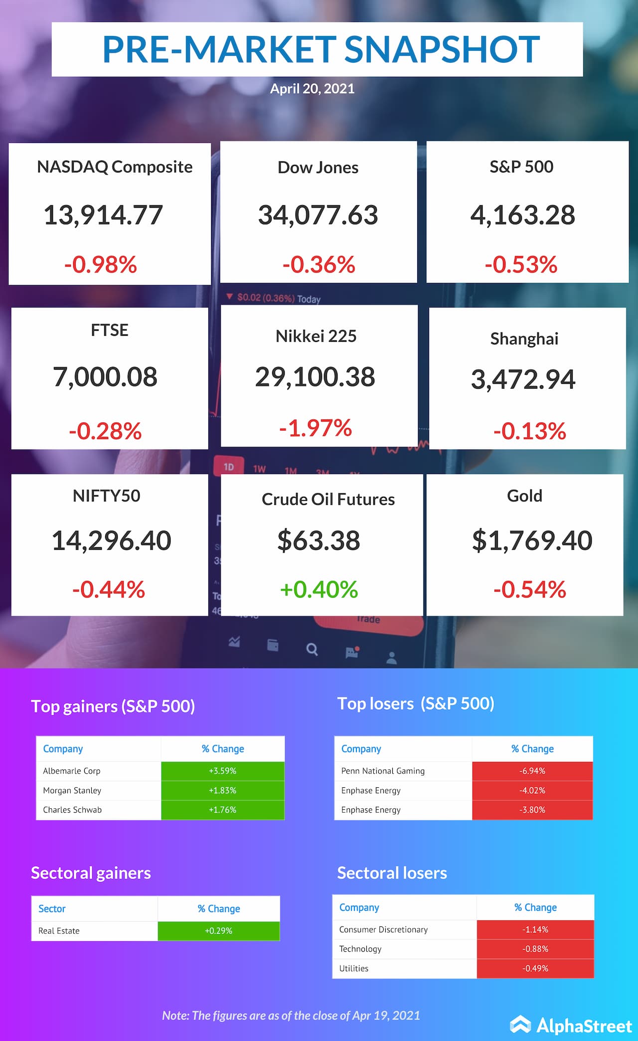 Wall Street is seen opening lower on Tuesday, the second day of losses after a series of record highs. Earnings from big tech companies and consumer-oriented firms are upcoming and a lot would depend on their performance. The yield on the benchmark 10-year Treasury was last traded around 1.60%, after falling as low as 1.53% last week.