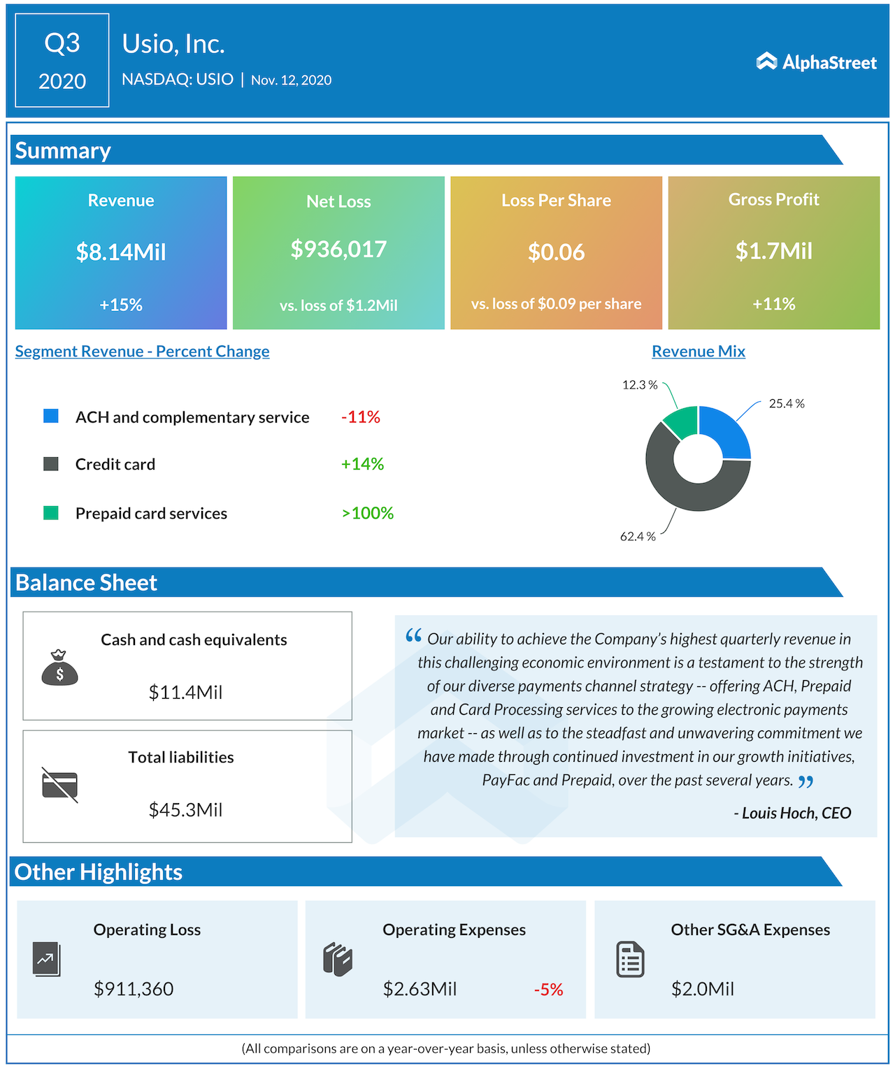 In an interview with AlphaStreet, Usio CEO Louis Hoch said it’s card segments are witnessing robust growth and will soon eclipse the ACH business. The growth engine transition was a discernible factor in the Q3 financials, where credit card transactions processed shot up over 80%. Meanwhile, five of the 10 largest US cities choosing Usio’s prepaid services for the disbursement of monetary assistance provided a fillip to the firm’s growth ambitions in Q3.