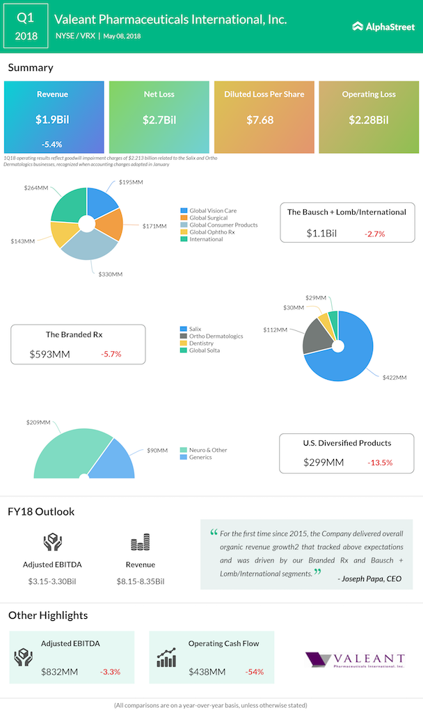 Valeant Pharmaceuticals (VRX) reported total revenues of $1.99 billion for the first quarter of 2018, a decrease of 5% from the same period last year. Organic revenue growth was 2%, driven by growth in the Salix business and the Bausch + Lomb/International segment.