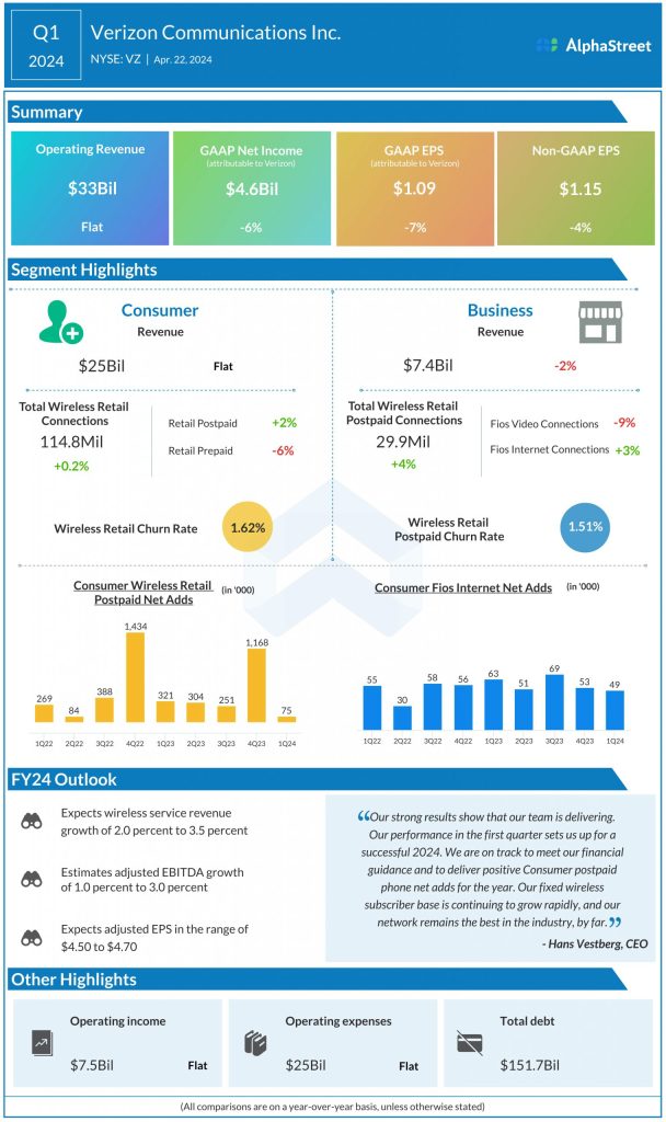 “Verizon Communications Inc. (NYSE: VZ) reported first quarter 2024 earnings results today. Total operating revenue was $33 billion, up 0.2% from the same period last year. Net income attributable to Verizon was $4.6 billion, or $1.09 per share, compared to $4.9 billion, or $1.17 per share, last year. Adjusted EPS was $1.15. Verizon expects adjusted […]