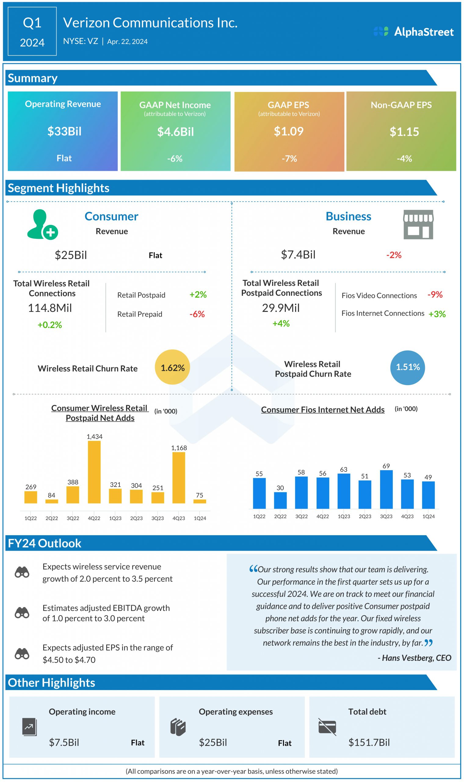 Verizon Communications Inc. (NYSE: VZ) reported first quarter 2024 earnings results today.