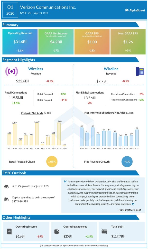 Verizon Communications (NYSE: VZ) reported first quarter earnings results for the period ended March 31, 2020.