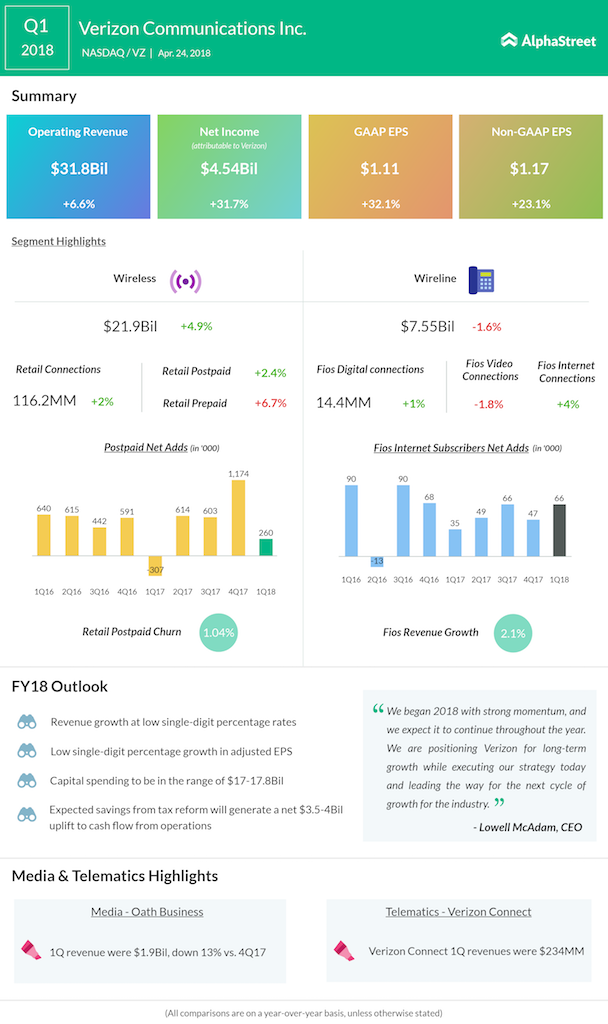 Verizon’s Q1 2018 results beat market estimates. Shares rose 3% in premarket trading.