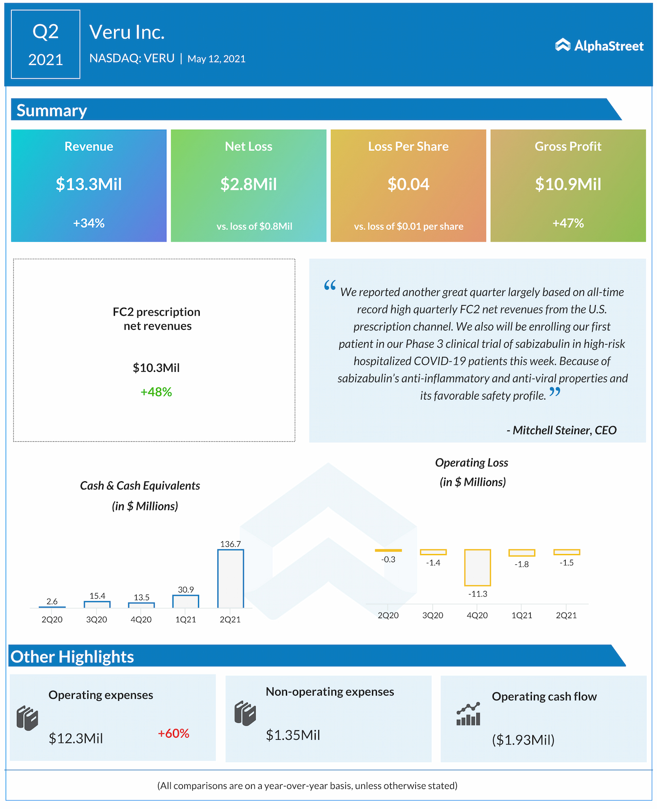 Veru Inc suffered a net loss of $2.8 million or $0.04 loss per share compared to the loss of $0.8 million or $0.01 loss per share of the same quarter in the previous year.