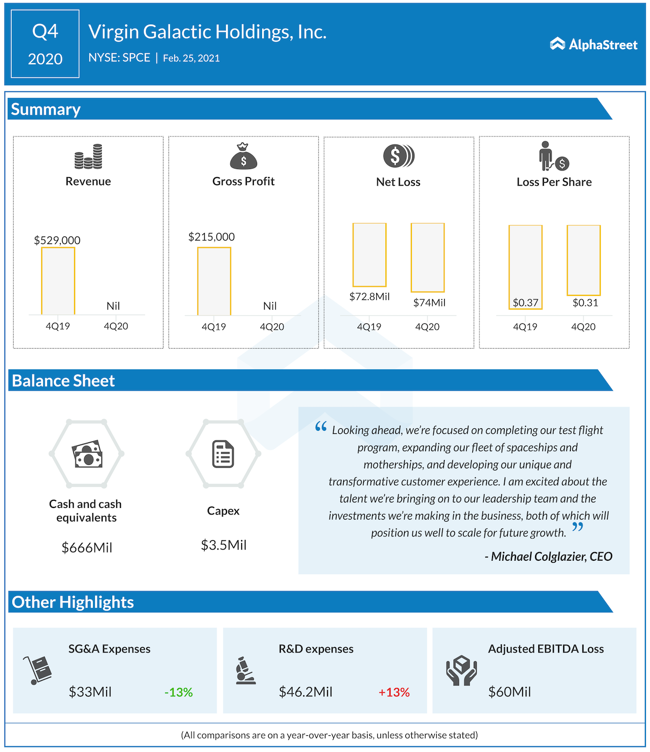 Virgin Galactic (NYSE: SPCE) reported fourth-quarter 2020 financial results after the regular market hours on Thursday. The space tourism company reported zero revenue in the fourth quarter, compared to $529,000 a year ago. Net loss of $0.31 per share was, meanwhile, in line with the average street estimate.