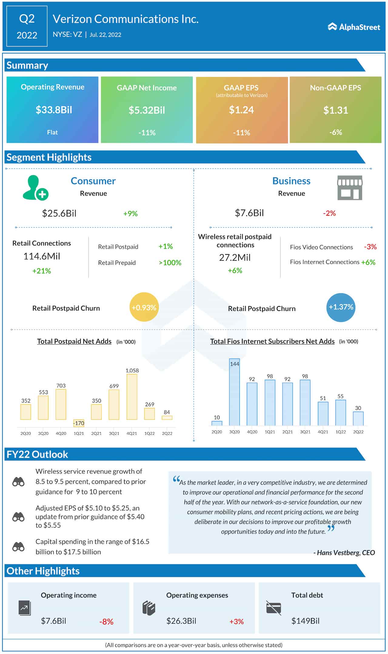 “As the market leader, in a very competitive industry, we are determined to improve our operational and financial performance for the second half of the year. With our network-as-a-service foundation, our new consumer mobility plans, and recent pricing actions, we are being deliberate in our decisions to improve our profitable growth opportunities today and into the future,” said Verizon’s CEO Hans Vestberg.