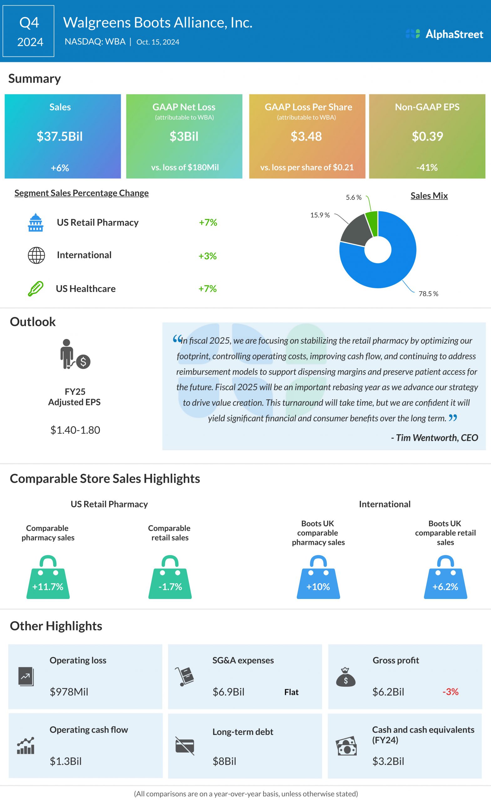 Walgreens reported a 6% annual growth in total sales to $37.5 billion in the final three months of fiscal 2024, beating estimates. Sales of the US Retail Pharmacy segment, which accounts for 79% of the total, grew by 7%. International sales and US Healthcare sales grew by 3% and 7%, respectively. Fourth-quarter profit, excluding special items, dropped 41% year-over-year to $0.39 per share but topped expectations. On an unadjusted basis, the company reported a net loss of $3.0 billion or $3.48 per share for Q4, compared to a loss of $180 million or $0.21 per share in the year-ago quarter.
