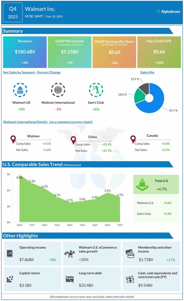 The retail giant’s net sales increased to $178.8 billion in the January quarter from $171.91 billion in the comparable period last year. Total revenue rose 4% to $180.6 billion. Comparable store sales rose 4.6% for the company’s US business.