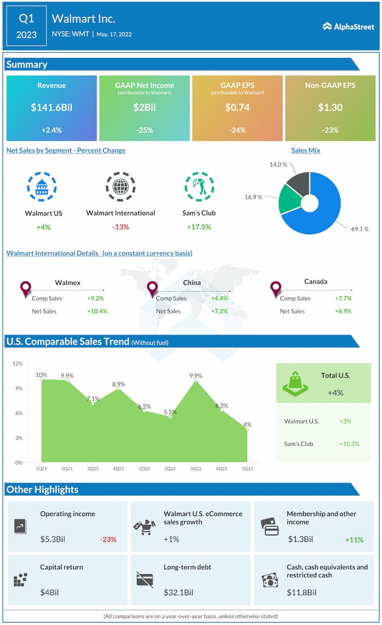 In Q1 2023, Walmart’s revenue increased 2.4% year-over-year to $141.6 billion, surpassing projections. On a constant currency basis, revenue grew 2.6%. GAAP earnings fell nearly 25% to $2.05 billion, or $0.74 per share, from the previous year. Adjusted EPS declined 23% YoY to $1.30, missing estimates. Total US comparable sales, excluding fuel, were up 4%.