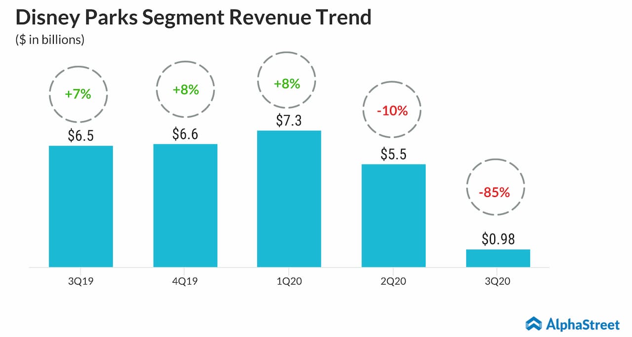 In the first quarter, Studio Entertainment revenues more than doubled year-over-year to $3.8 billion helped by the performance of Frozen II and Star Wars: The Rise of Skywalker. In the second quarter, revenues increased 18% despite the closure of theaters due to the pandemic. Revenues took a huge hit in the third quarter dropping by 55% as theaters remained closed and no significant titles were released.