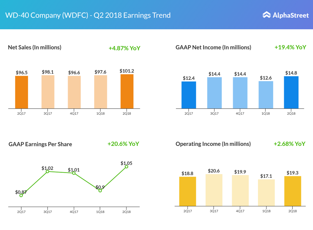 Household chemicals manufacturer WD-40 Company (WDFC) reported positive top and bottom line results for its second quarter 2018, with profit spiking double digits and sales increasing by single digit. The results were positively impacted by growth from the company’s EMEA and Asia-Pacific segments. Profit increased 19.4% to $14.8 million or $1.05 per share, while sales increased 4.8% year-over-year to $101.2 million.
