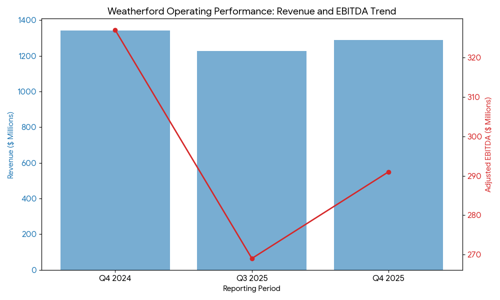 Weatherford reported consolidated revenue of $1,289 million for the fourth quarter of 2025, a 5% increase from the previous quarter but a 4% decline compared to the same period in 2024. Net profit for the quarter was $138 million, representing a year-over-year increase of 23% and a sequential rise of 70%. Adjusted EBITDA reached $291 million with a margin of 22.6%.