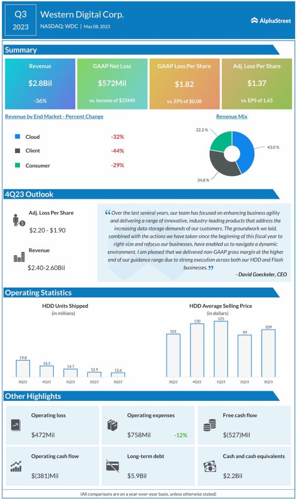 Western Digital Corp. (NASDAQ: WDC) reported revenue of $2.8 billion for the third quarter of 2023, which was down 36% year-over-year.
