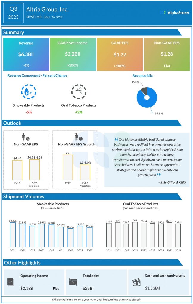 On the other hand, the company has been benefiting from growth in its oral tobacco products segment, which saw revenues increase over 2% in Q3. Shipment volume for on! nicotine pouches grew nearly 37% last quarter.