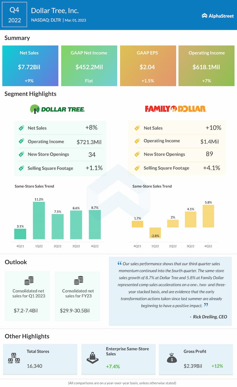 Dollar Tree has guided for consolidated net sales of $7.2-7.4 billion for the first quarter of 2023. Analysts are projecting revenue of $7.2 billion, which would represent a growth of 5% from the same period a year ago. In the fourth quarter of 2022, consolidated net sales increased 9% year-over-year to $7.7 billion.