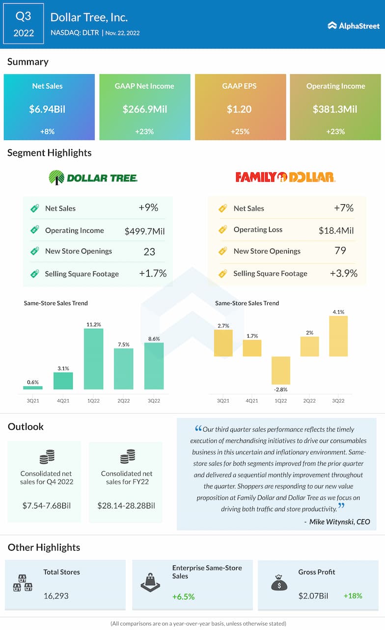 Dollar Tree has guided for consolidated net sales of $7.54-7.68 billion for the fourth quarter of 2022. Analysts are projecting sales of $7.6 billion for Q4. This compares to net sales of $7.08 billion reported in Q4 2021. In Q3 2022, consolidated net sales increased 8% year-over-year to $6.94 billion.