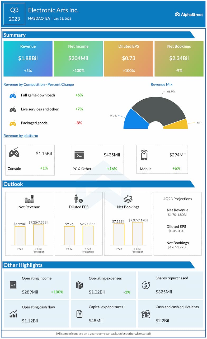 Electronic Arts has guided for revenue of $1.70-1.80 billion in Q4 2023. Analysts are projecting revenue of $1.76 billion, which compares to $1.82 billion reported in Q4 2022. In the third quarter of 2023, revenue increased 5% year-over-year to $1.88 billion.