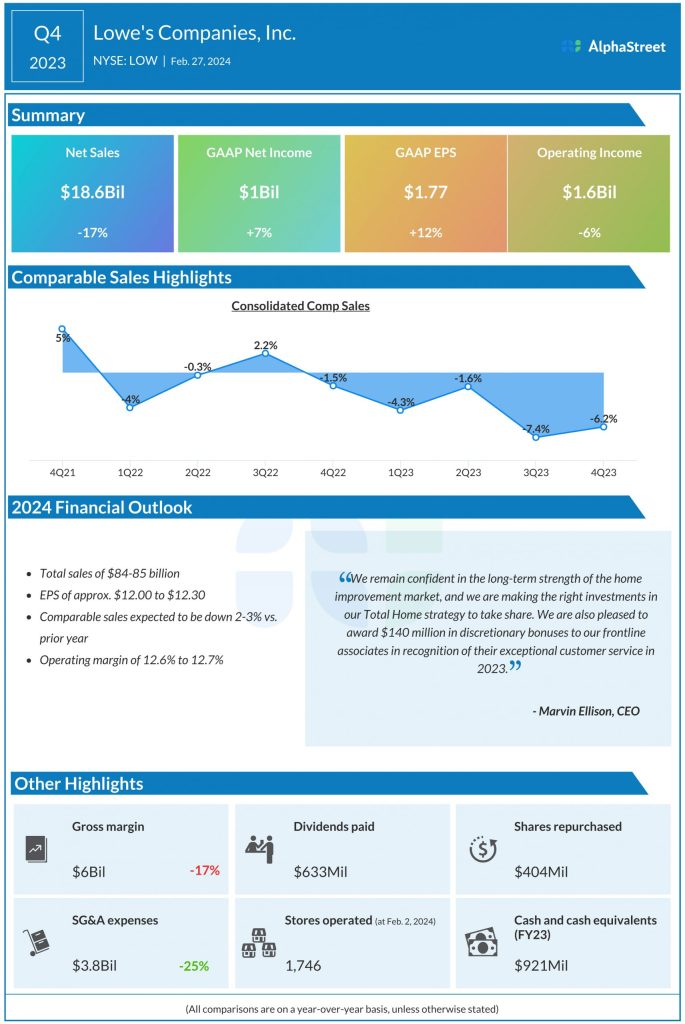 On its last quarterly call, Lowe’s said it remains uncertain about the near-term macro environment. Factors such as interest rate cuts and housing turnover are expected to put pressure on home improvement spending in 2024, which provides a somewhat bleak outlook for Q1. The company has forecast comp sales for full-year 2024 to decline 2-3% and it expects comps for the first quarter to be consistent with Q4 2023 results, approx. 300 basis points below the bottom of the full year guidance.