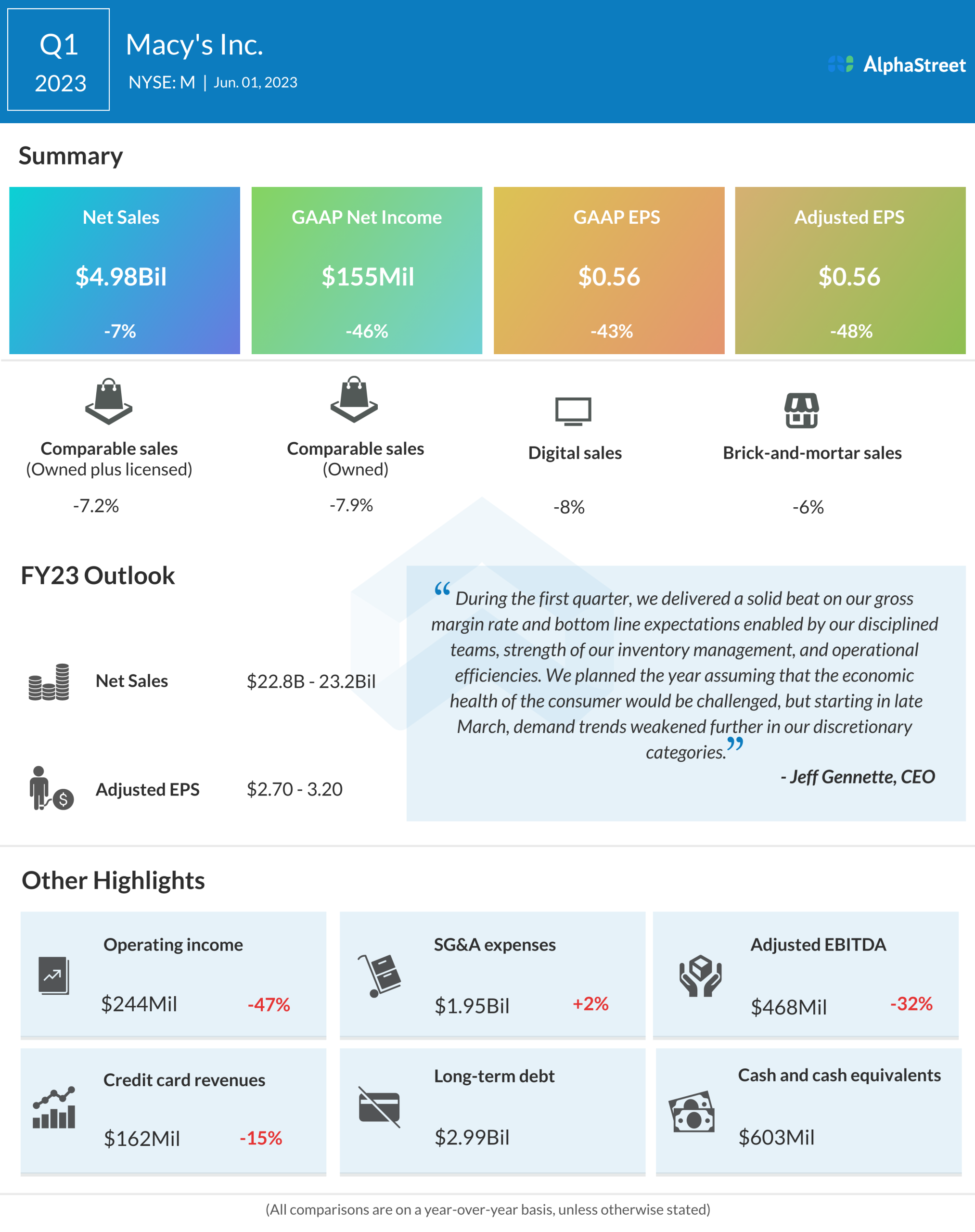 Macy’s continues to be pressured by a challenging economic environment and shifts in consumer spending. Demand for discretionary categories weakened as customers moved their spending to food and essentials. Comparable sales fell 7.9% on an owned basis and 7.2% on an owned-plus-licensed basis. These pressures are expected to continue in the second quarter.