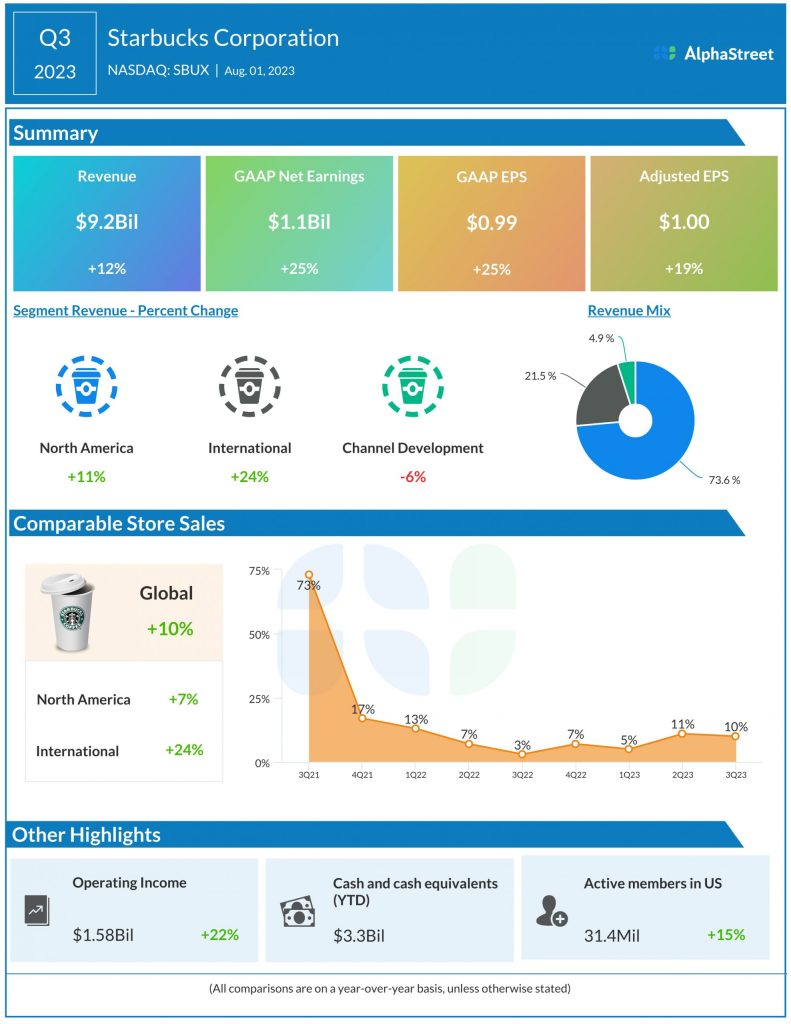 Starbucks saw strong momentum in its business during the third quarter with revenue and earnings growth in the double-digits. Comparable sales grew 10%, driven by increases in transactions and average ticket. The company has benefited from brand strength, product innovation and its Reinvention Plan. This is expected to continue in the fourth quarter as well.