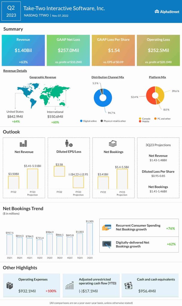 For Q3 2023, Take-Two expects a net loss of $160-142 million and loss per share of $0.95-0.85. In the year-ago quarter, the company reported net income of $144.5 million, or $1.24 per share. In Q2 2023, net loss was $257 million, or $1.54 per share. Analysts are projecting EPS of $0.87 for Q3.