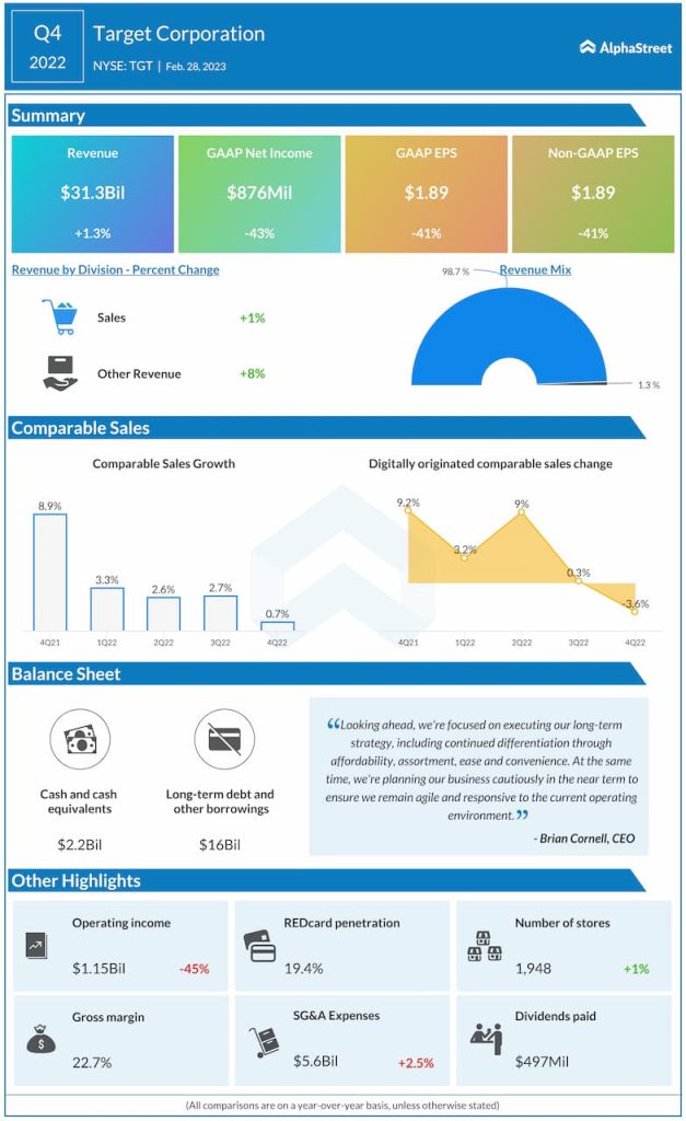 Target has guided for adjusted EPS of $1.50-1.90 for the first quarter of 2023. The consensus estimate for EPS is $1.77. This compares to adjusted EPS of $2.19 reported in Q1 2022 and $1.89 reported in Q4 2022.