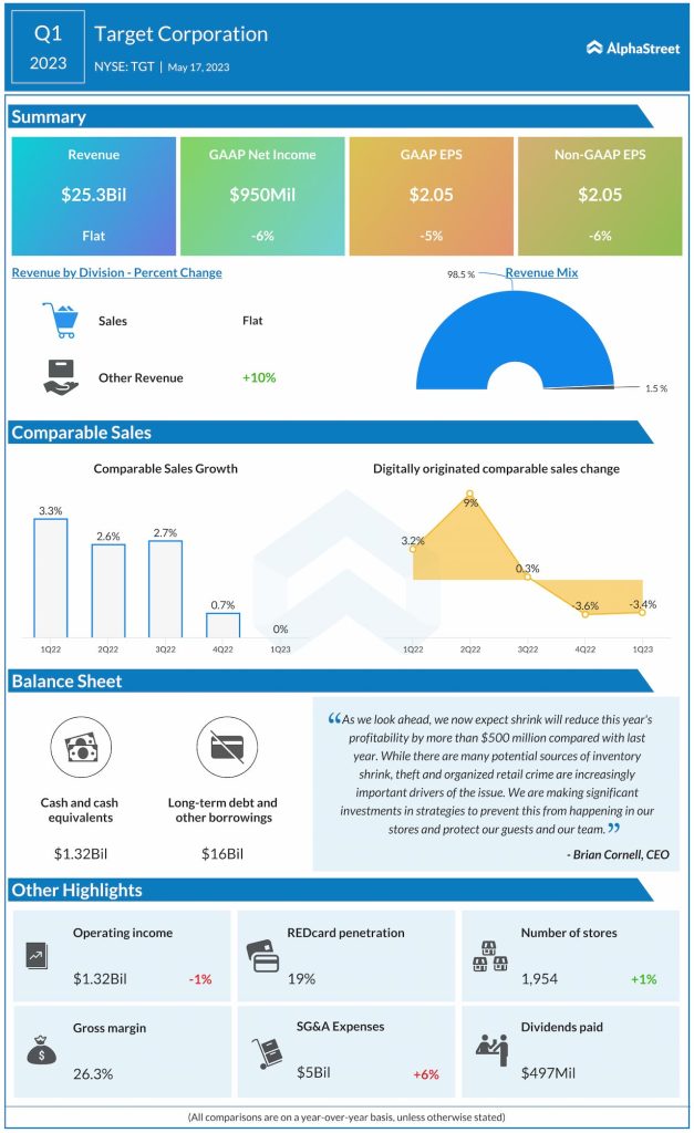 Target has guided for both GAAP and adjusted EPS to range from $1.30-1.70 in Q2 2023. Analysts are predicting EPS of $1.41 which compares to $0.39 in the year-ago period. In Q1 2023, GAAP EPS fell 4.8% to $2.05 while adjusted EPS dropped 6.2% to $2.05 versus the prior-year period.